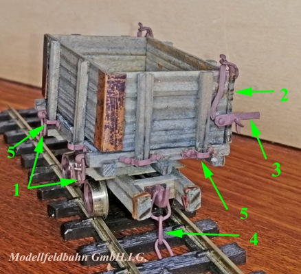 1 Kastenhalteösen und Kastenhalteklinken 2 bewegliche Klappe 3 Kastenklinke 4 Kupplungskette mit Haken 5 Kastenwandhalter für das Abnehmen der Kastenwände |